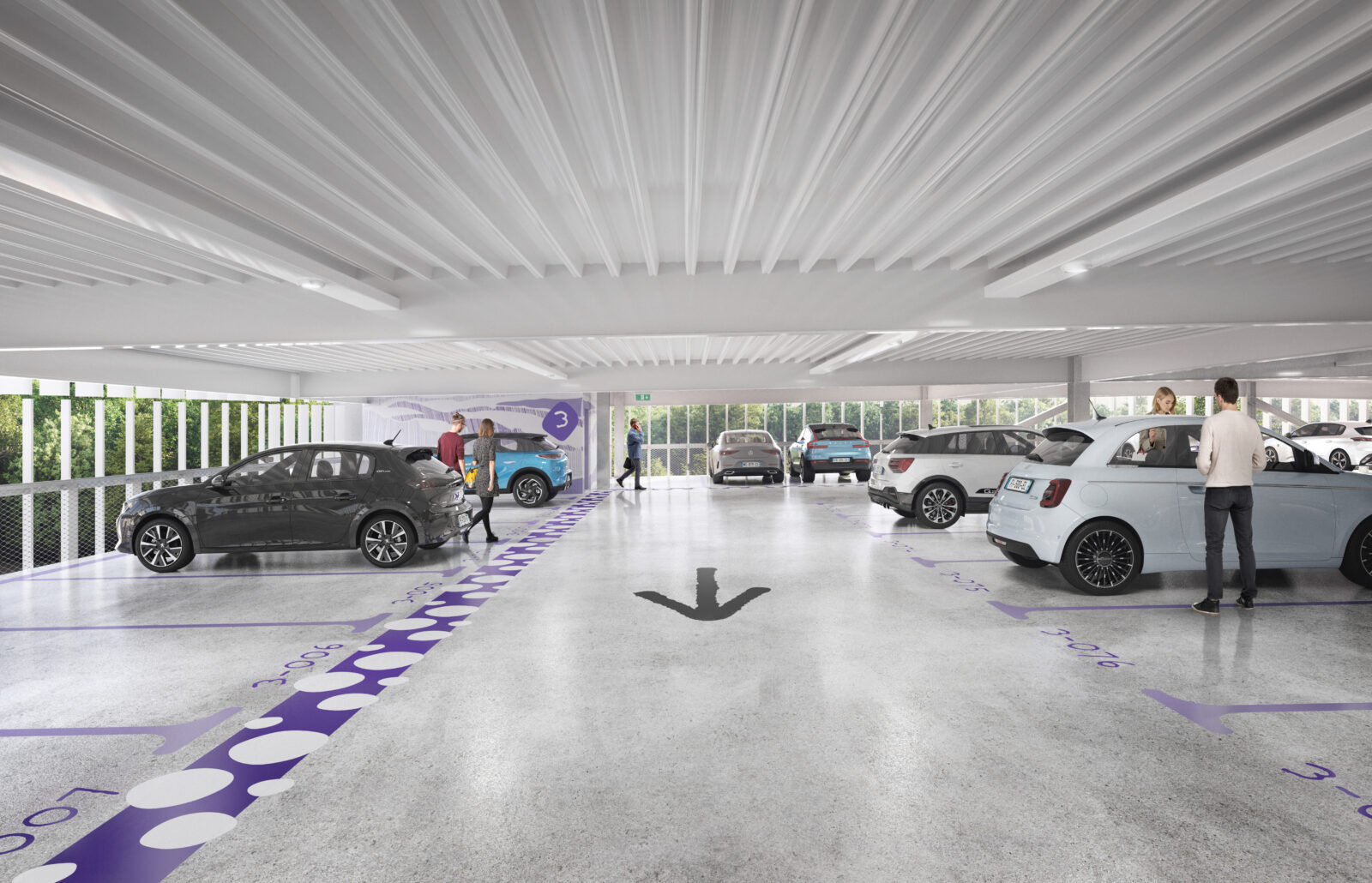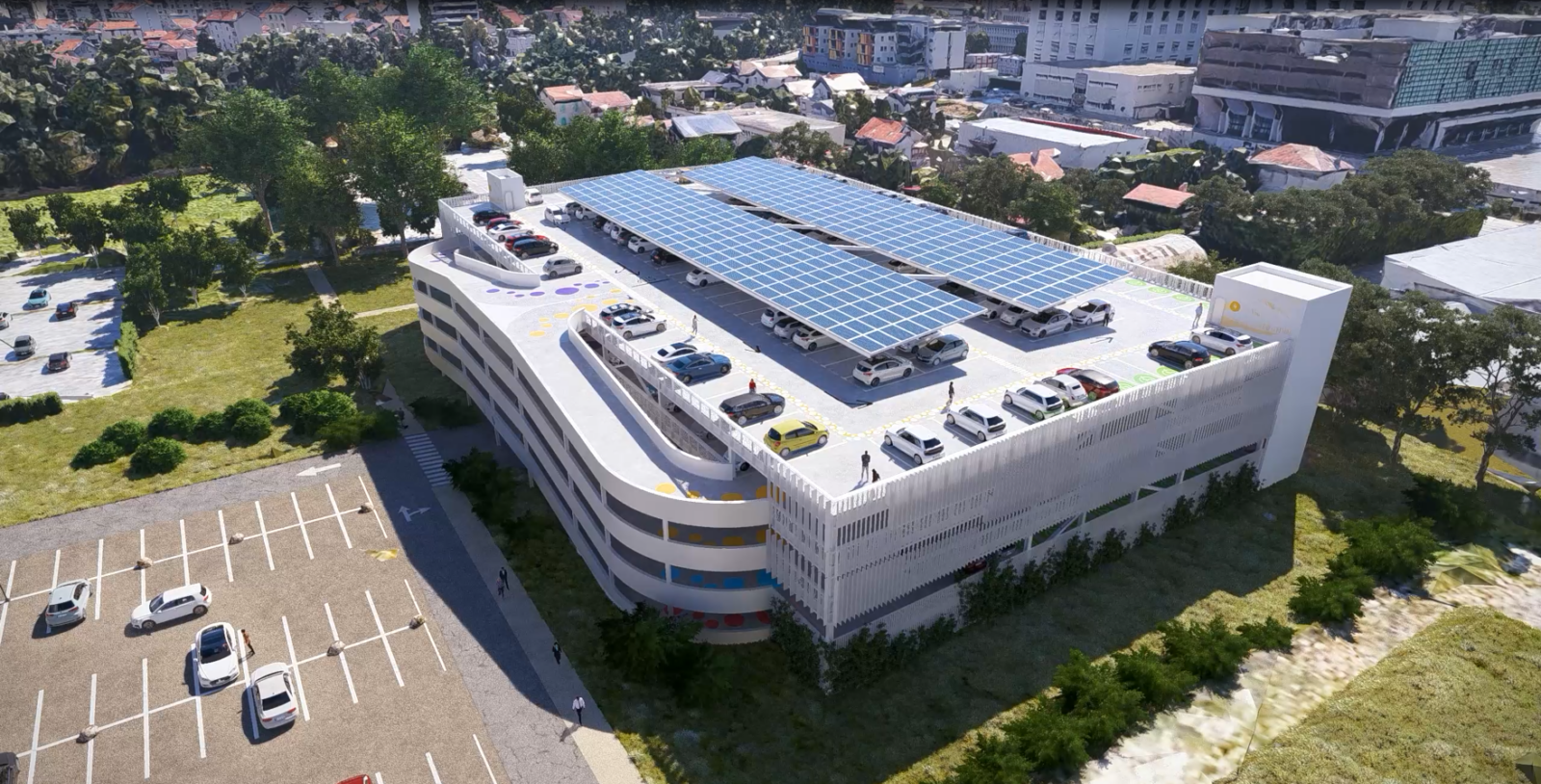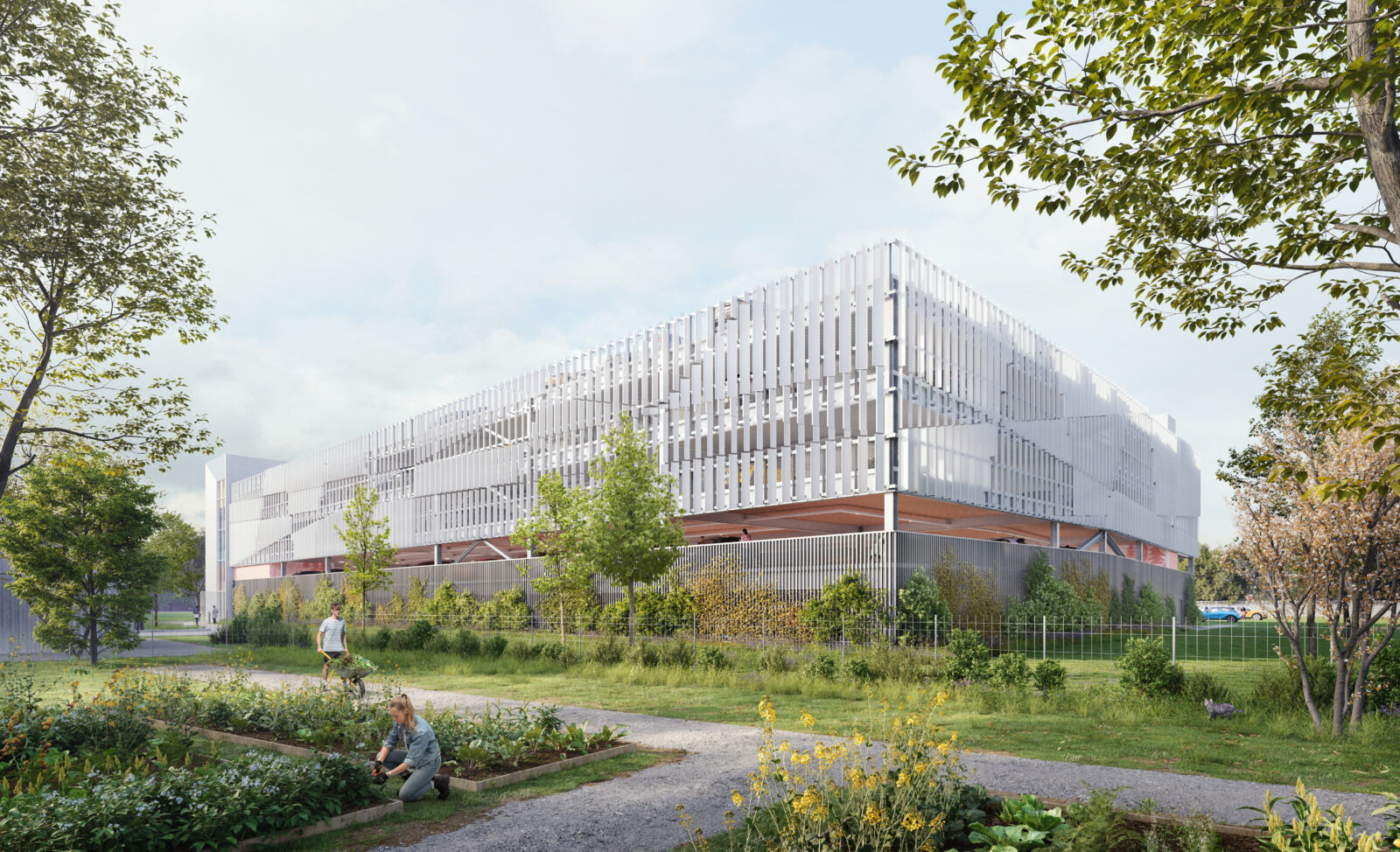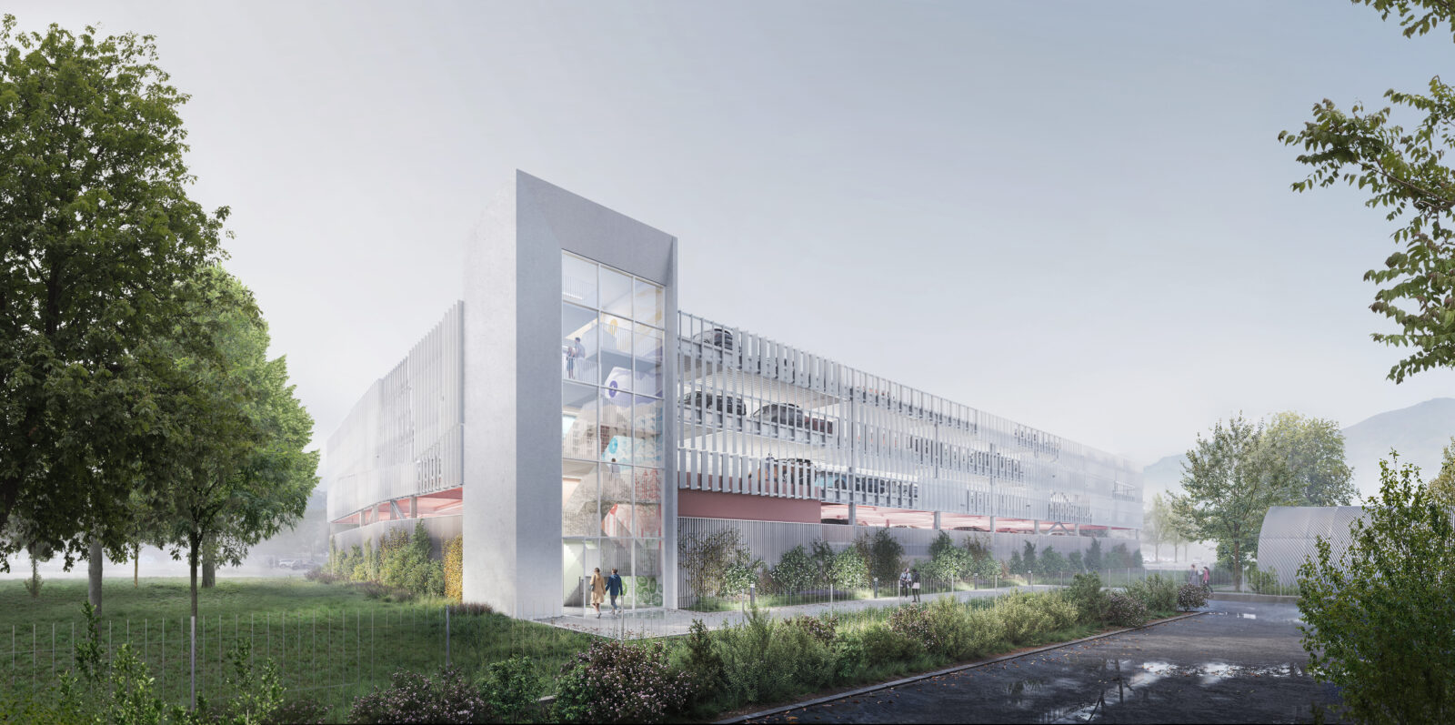 Le projet vise à créer un espace accueillant, lisible et harmonieux, en rupture avec l’image souvent austère des parkings hospitaliers. Son but est d’offrir un lieu fonctionne et apaisant, intégrant une architecture moderne et épurée qui valorise la lumière naturelle, la végétation et une signalétique douce. Implanté dans un environnement naturel, il respecte les limites urbaines tout en conservant un lien avec l’hôpital et le tissu pavillonnaire voisin. La conception privilégie une structure métallique légère, avec des façades en lames verticales évoquant un paysage géométrique, permettant ventilation et transparence. La végétalisation, notamment par des arbres et des strates végétales, contribue à la gestion des eaux pluviales et à l’intégration paysagère. La signalétique, aux couleurs apaisantes et aux motifs inspirés du Zentangle, crée une ambiance chaleureuse et relaxante. L’ensemble offre une expérience architecturale qui transforme un simple espace de stationnement en un lieu d’accueil, de transition douce, reflet de l’image soignée et humaine du CHU La Tronche..