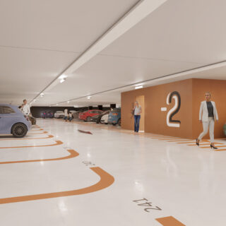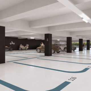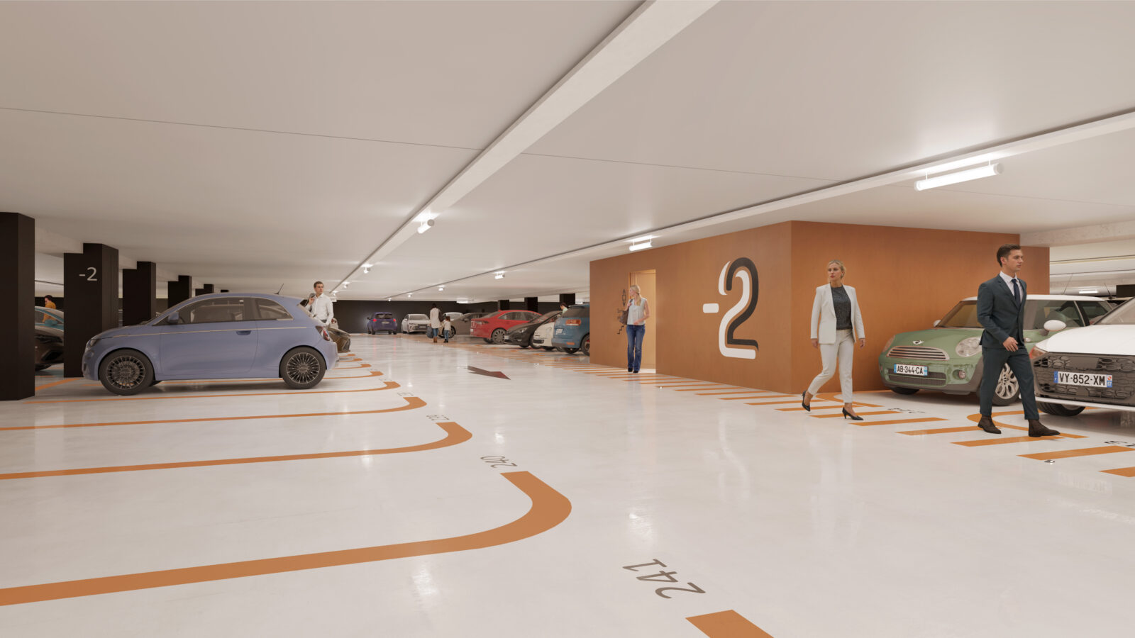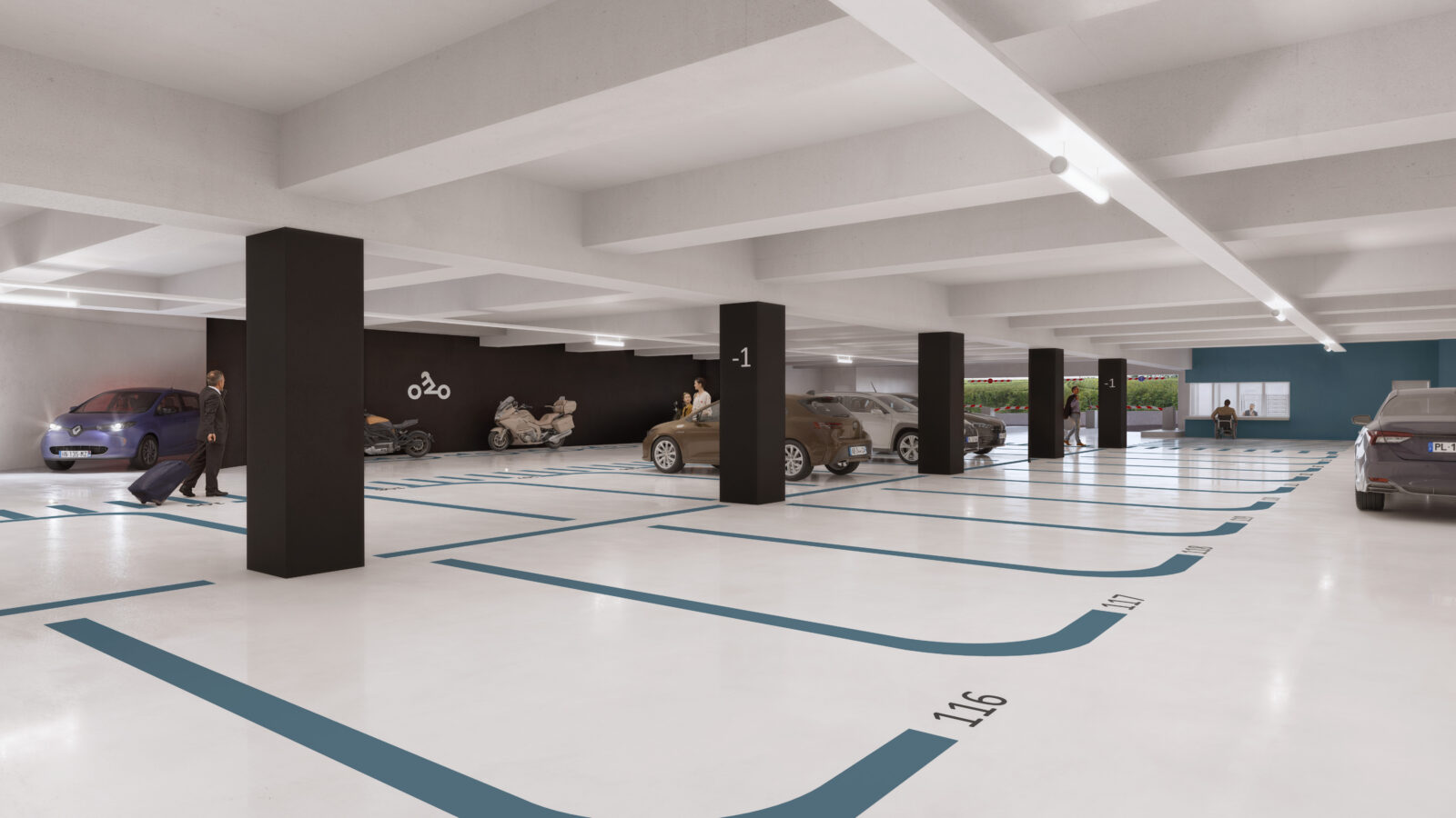 La conception du parking est sobre et unifiée avec une signalétique claire qui facilite l’orientation. L’intérieur est lumineux, lisible et sécurisé, avec un marquage au sol optimisé et des espaces dédiés aux vélos, motos, IRVE et PMR sur deux niveaux. Les rampes, conçues de manière simple, assurent fluidité et sécurité.