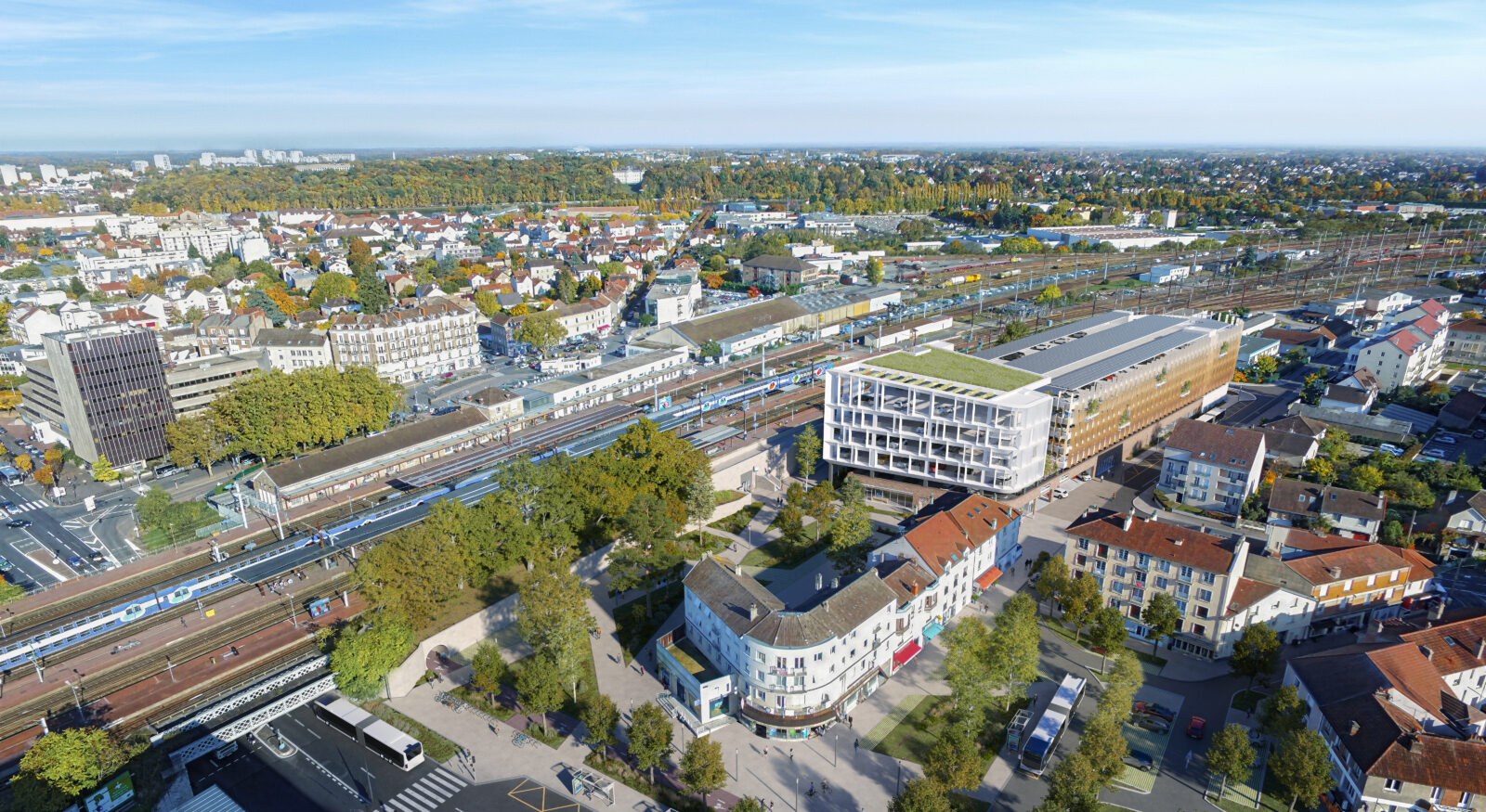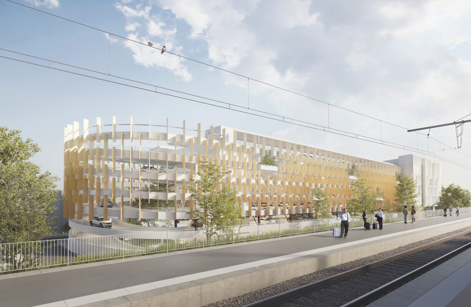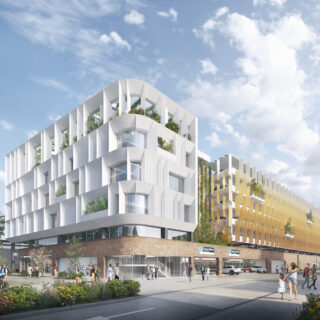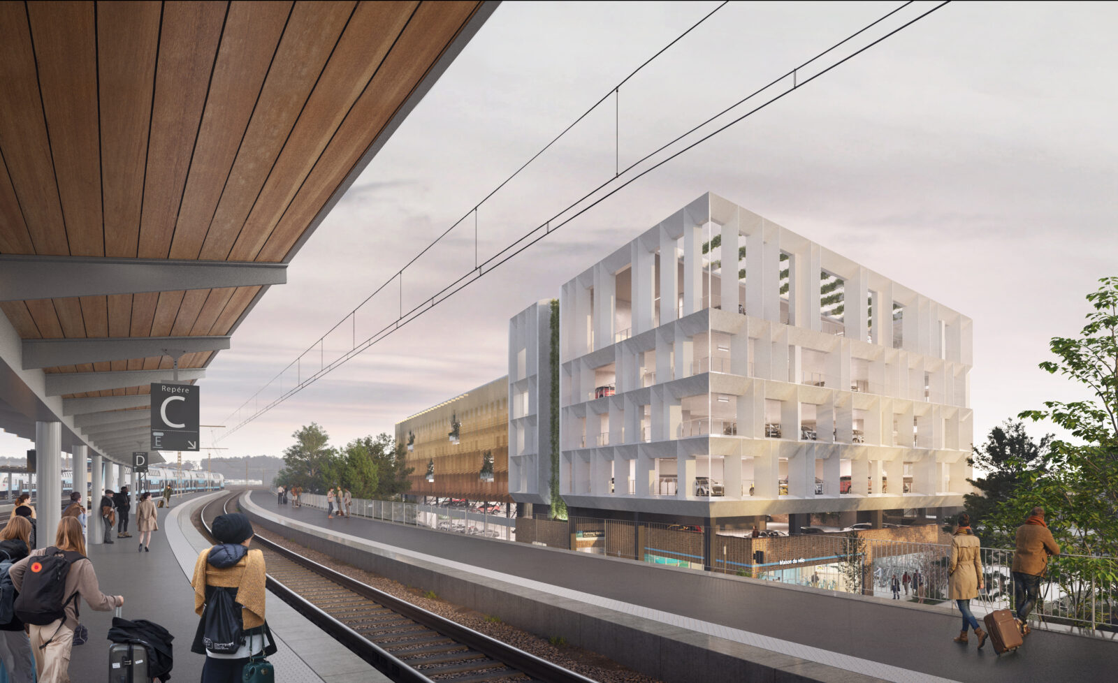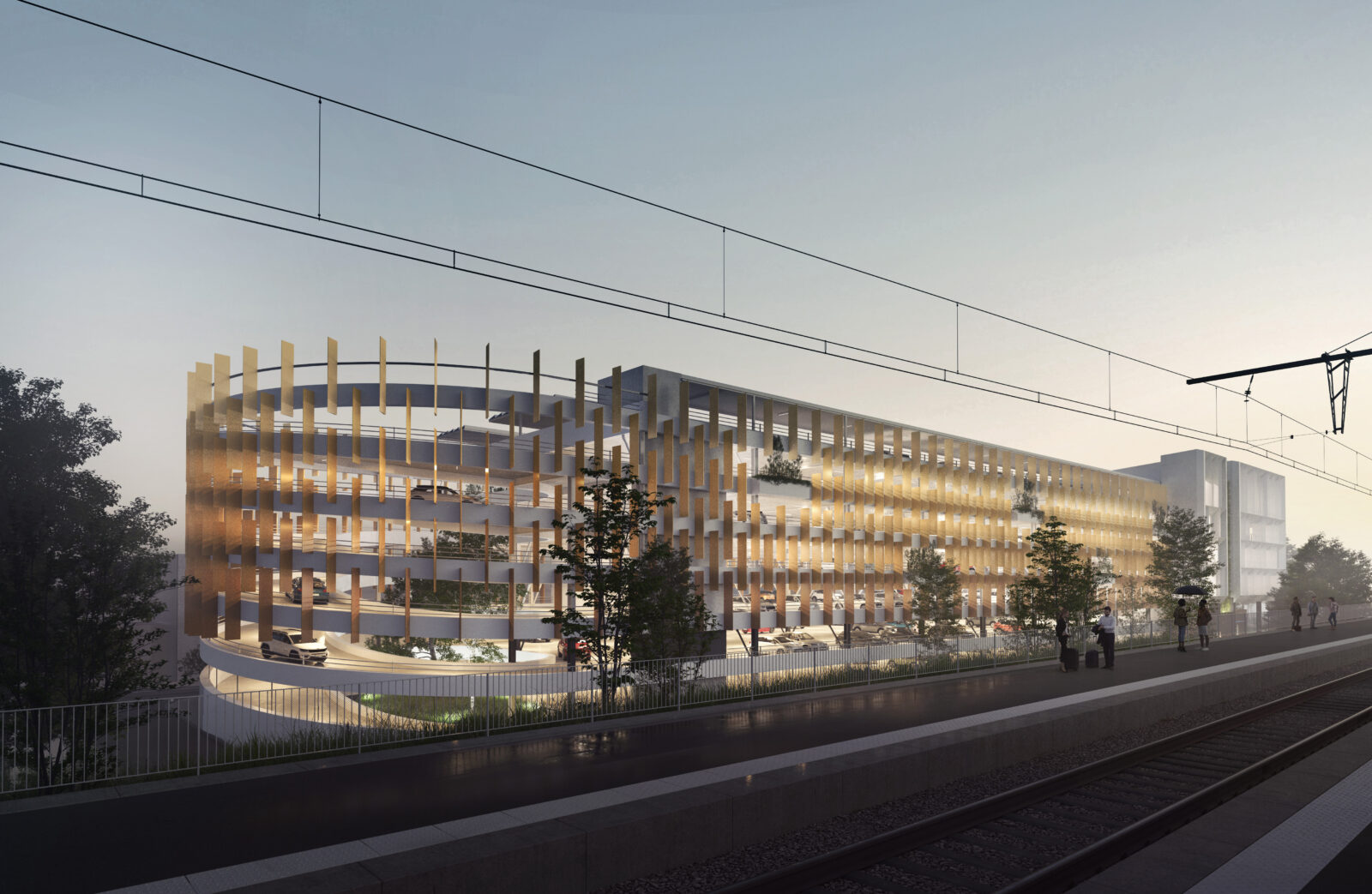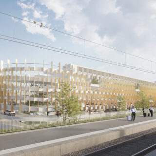 Le projet de Parking Relais de Melun s’inscrit dans la requalification du pôle gare, avec pour objectif une meilleure intermodalité et une intégration urbaine respectueuse. Situé à la frontière du quartier résidentiel de La Rochette, ce parking silo de 950 places (R+5+toiture) allie fonctionnalité, frugalité et réversibilité. Son architecture aérée, rythmée par des lames métalliques et intégrée dans un socle en pierre, atténue son impact visuel. Pensé pour une possible reconversion en bureaux, le bâtiment adopte une structure partiellement réversible. Végétalisé en toiture et en façade, connecté aux mobilités douces, il s’inscrit dans une dynamique de durabilité, de confort d’usage et d’harmonie avec son environnement.