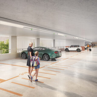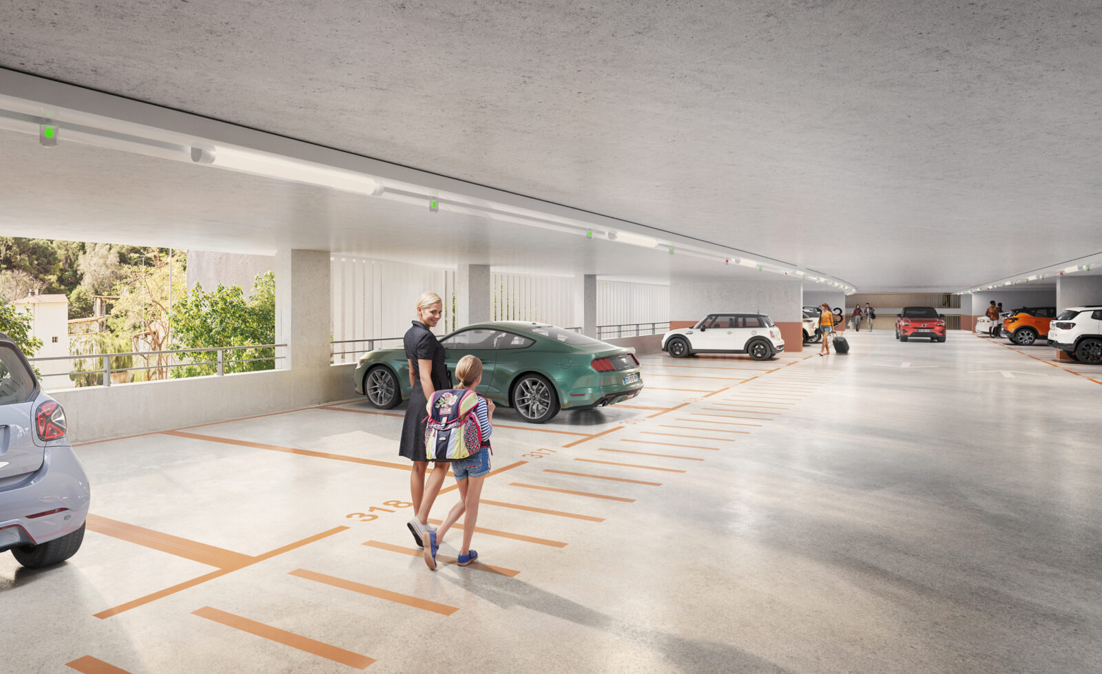 La façade, rythmée par des lames verticales et des balcons stylisés, crée un jeu de transparence et de lumière. La conception intègre également une signalétique colorée et des espaces ouverts, pour faire du parking un lieu de transition agréable, en harmonie avec son environnement. La réflexion architecturale met ainsi l’accent sur la qualité spatiale, la relation à la ville et la durabilité, faisant de ce parking un objet urbain à la fois fonctionnel, esthétique et respectueux de son contexte.