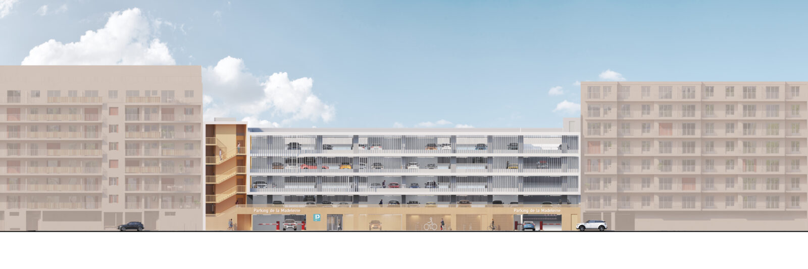 Le parti pris architectural de ce parking silo repose sur une démarche d’intégration urbaine. Son design privilégie la lisibilité, la douceur et l’épuration, en utilisant des matériaux simples, durables et pérennes, comme le béton clair, le métal déployé doré et les lames blanches évoquant le rythme des balcons résidentiels environnants. La volumétrie, modérée à 14,5 mètres de haut, s’inscrit dans la continuité du tissu urbain, tout en proposant une silhouette élégante, légère et contemporaine.